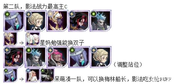 影法战力最高主C,星妈勉强能换双子(调整站位),呆萌凑一队,可以换梅林船长,影法吃女枪BUFF。