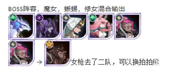 BOSS阵容,魔女,蜥蜴,修女混合输出。女枪去了二队,可以换拍拍熊。