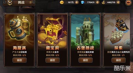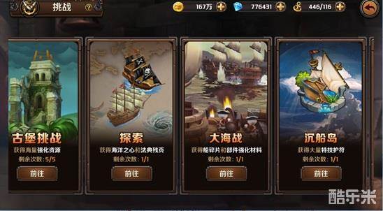 3. 挑战副本:多样的玩法,可以提供给各位海盗们丰富的日常娱乐,在您探索加勒比海的同时,也不要忘记去那些藏宝洞,古堡挑战一番,说不定还有一番奇遇!当然咯,有财宝的地方伴随着战斗!海盗们的战斗总是那么强烈,震撼人心的,大海战是各位海盗们不容错过的玩法之一!