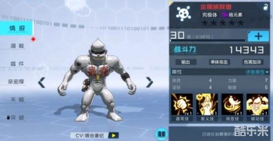 金属猿猴兽全额加满输出系,一拳一个小朋友。因为被动技“全金属化”的存在,只要叠满状态,金属猿猴兽不用点生存、防御天赋就能比较耐揍。大家也可以根据喜好,点上防御强化及、闪避强化。