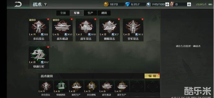 游戏中的战术系统是一个辅助系统,可以理解为指挥官的战场技能。目前战术系统共分为军事、生产、通用三大类,每一类的战术都有它独特的受众群体以及特殊的属性加成。指挥官需要通过花费钻石来解锁新的战术,随后使用金币升级战术,战术等级越高,对应的属性加成也就越多。