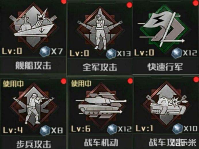 步兵攻击:大幅提升步兵的伤害(升满30级后伤害加成28%、持续时间62秒、战术点消耗7)对于喜欢前期抢占资源点的指挥官来讲,在与敌人交锋时使用步兵攻击可以大幅度提升作战效率,对敌人完成碾压然后占领点位获取资源后获得先手机会。