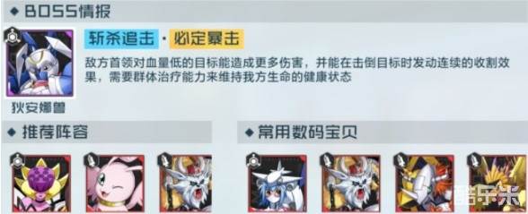 1. 建议选用群体治疗能力强的数码兽来保持队伍血线健康;一旦血量低于75%,BOSS就能额外造成更多的伤害,如果有数码兽被斩杀,BOSS还能连续收割带来毁灭性打击;