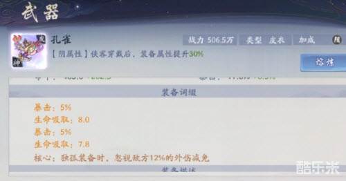 这里用孔雀举例,该武器由阴属性刺客穿戴后,装备属性提升30%。