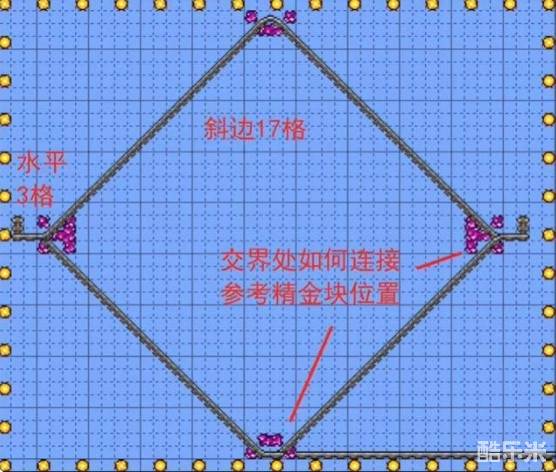 菱形矿道的四个边需要17格轨道,左右两端需要搭建水平三格的矿道。搭建要点在于要讲两端的尽头用锤子敲成一个会将矿车回弹的弹簧型桩子,以及铁轨的连接处也用锤子敲好。