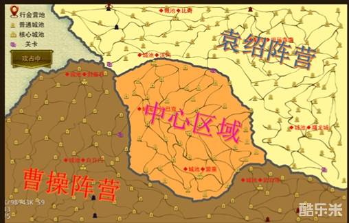 玩法介绍:决胜中原跨服阵营战是以阵营为单位来进行争夺的全新赛季。在本赛季中,战场分为两个阵营:曹操阵营、袁绍阵营。两个阵营共争天下。活动正式开启后,8个帮会将会平均分配到两个阵营中,以阵营为单位进行城池的争夺。