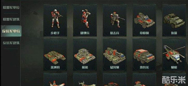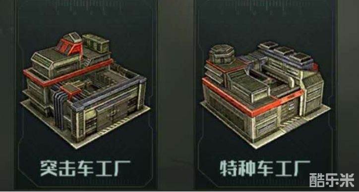 游戏内对战车单位的定义是从突击车工厂与特种车工厂生产出来的单位。以反抗军为例,下面两张图分别会列出生产战车的建筑以及游戏内战车单位的图例: