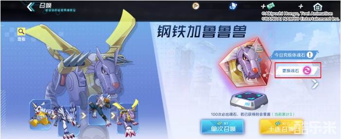 分子兽提供的魂石置换功能会有7天的冷却时间,在大家普通召唤的过程中,如果有自己心仪的究极体魂石需求,可以先点击【更换魂石】并消耗一定晶钻进行魂石更换,这样就不会浪费普通召唤券。