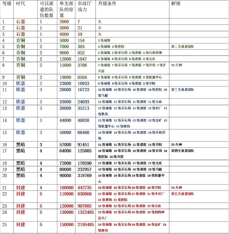 随着派遣队伍数量的提升(最多五支部队),大家采集的效率也会越来越高!每天更多的资源收入意味着更快的游戏进度!其次,市政厅等级越高也意味着单支部队的基础容量也会越高,在前期战斗时也是一种优势!