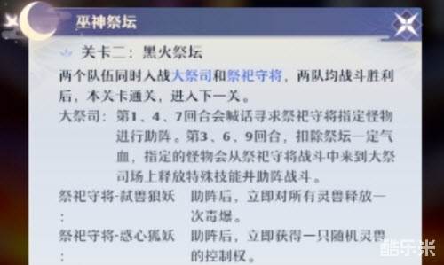 3、第二关祭坛会召唤三种怪物,狐狸或狼或者牛。召唤出来优先处理掉。狐狸会控妖笛导致宝宝死的快。牛输出很爆炸,狼则对灵兽威胁较大。辅助可以考虑带个披坚执锐降低团队生存压力。
