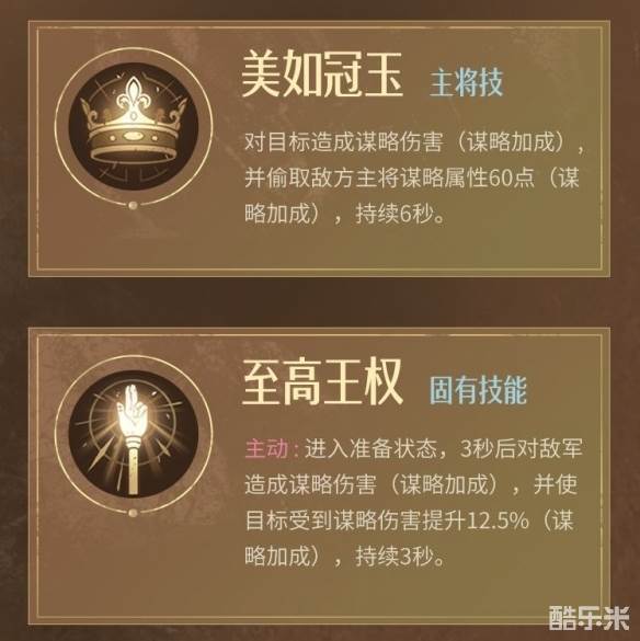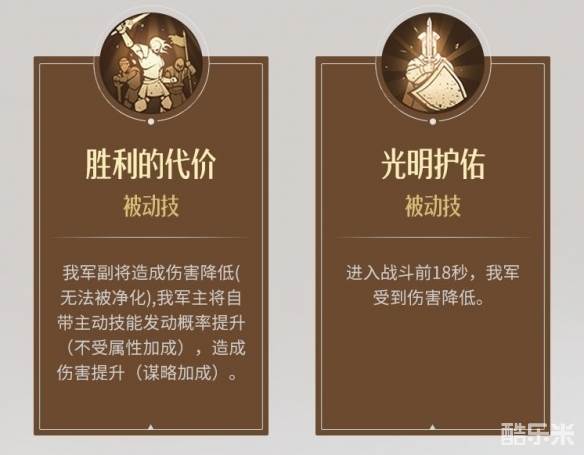 我军副将造成伤害降低(无法被净化),我军主将自带主动技能发动概率提升(不受属性加成),造成伤害提升(谋略加成)。