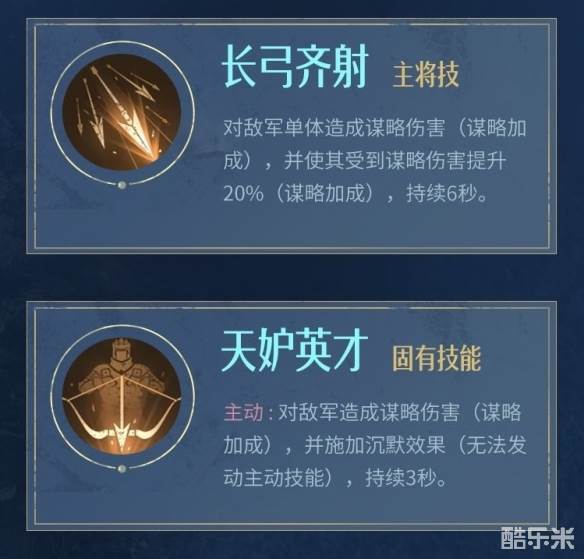 主动:对敌军造成谋略伤害(谋略加成),并施加沉默效果(无法发动主动技能),持续3秒。