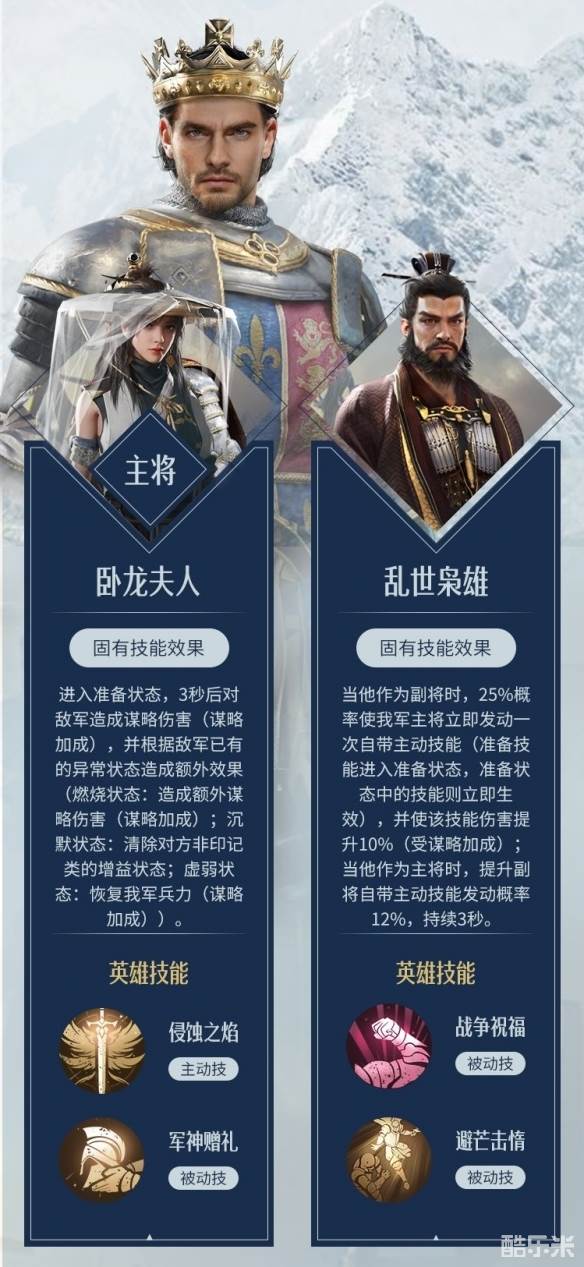 被动:我军副将造成伤害降低(无法被净化),我军主将自带主动技能发动概率提升(不受属性加成) 造成伤害提升(谋略加成)。