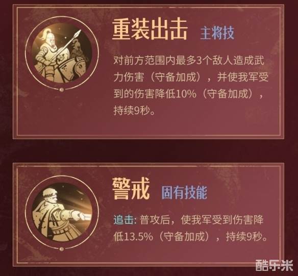 追击:普攻后,使我军受到伤害降低13.5%(守备加成),持续9秒。
