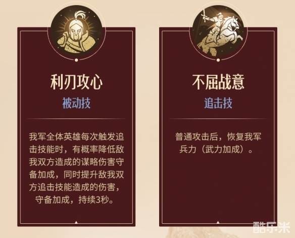 追击:普通攻击后,恢复我军兵力(武力加成)。