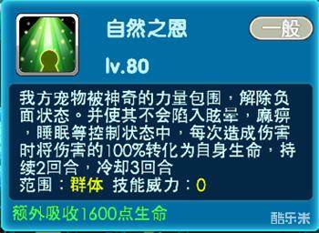 雪拉比【治愈愿望】驱散我方宠物所有异常状态,回复20%生命值,并施加一层守护护盾。【自然之恩】我方宠物被神奇的力量保卫,解除负面状态。并使不会陷入眩晕,麻痹,睡眠等控制状态中,每次造成伤害的100%转化为自身生命,持续2回合,冷却3回合。能够保证全体血量!