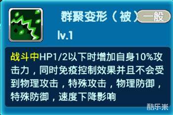 基格尔德被动技能【群聚变形】战斗中当HP1/2以下时增加自身10%攻击力,同时免疫控制效果并且不会受到物理攻击,特殊攻击,物理防御,特殊防御,速度下降影响。这个被动技能如果能够触发,可以使基格尔德获得超高的攻击力!