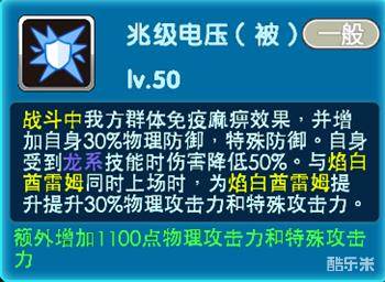 当亲密度达到三十级的时候-兆级电压:战斗中我方群体免疫麻痹效果,并增加自身30%物理防御,特殊防御。自身受到龙系技能时伤害降低50%。与焰白酋雷姆同时上场时,为焰白酋雷姆提升30%物理攻击力和特殊攻击力。属于被动技能。