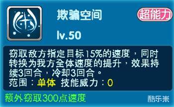 欺骗空间:窃取敌方指定目标15%的速度,同时转换为我方全体速度的提升,效果持续3回合,冷却3回合。
