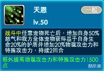 天恩:战斗中任意宠物死亡后,增加自身50%怒气和我方全体宠物获得基于自身生命20%的护盾并增加20%物理攻击力和特殊攻击力,持续2回合。