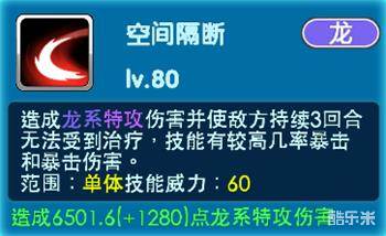 【空间断裂】可以照成龙系特攻伤害并使地方持续3回合无法受到治疗,虽然技能是单体攻击,不如伊裴尔塔尔的神龙俯冲这样全体伤害,但是只要针对对方主力宠物,也是有不错的效果的!