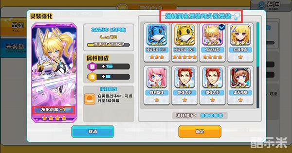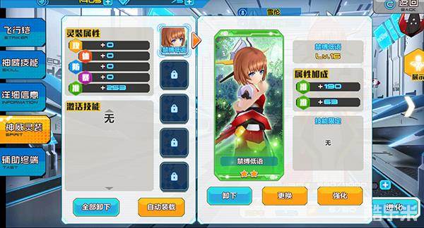 「灵装」可以通过「强化」消耗其他「灵装」或「经验灵装」,来提升「灵装」等级增加属性加成。通过「强化」消耗相同「灵装」,为「灵装」升阶增加属性加成。
