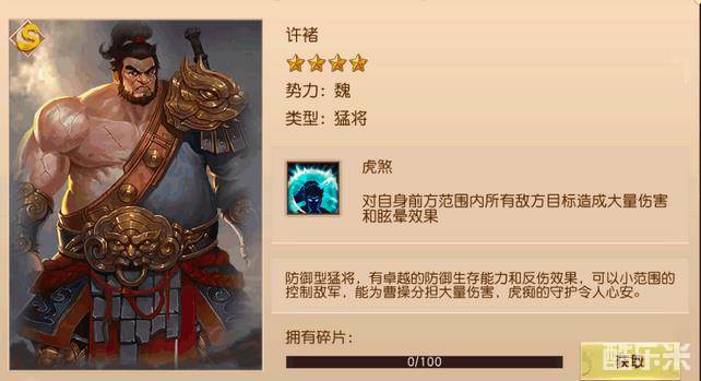 还有一个更厉害的武将,也是免费赠送的,连续性登录7 天即可送的武将,许褚,许褚一看大家都明白就是一个非常好用的 T ,许褚主要的位置是在前排当冲锋,许褚的技能也是相当的不错,自身的技能会回血的效果,用来当 T 也是个很不错的武将。