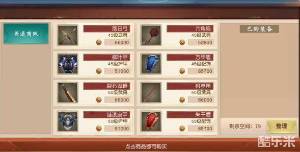 武将拥有好的装备可以大大提升武将实力,不要小看装备铺呀!装备铺可购买到白色装备、蓝色、绿色、紫色、以及还有大家都要想要的橙色装备,在装备铺想要购买好的装备,在装备铺有一定的几率可以获得橙色装备的呢!首先要有很多的铜币才行,装备铺只能使用铜币购买装备,所以要攒够铜币,就可以尽情的买装备吧!