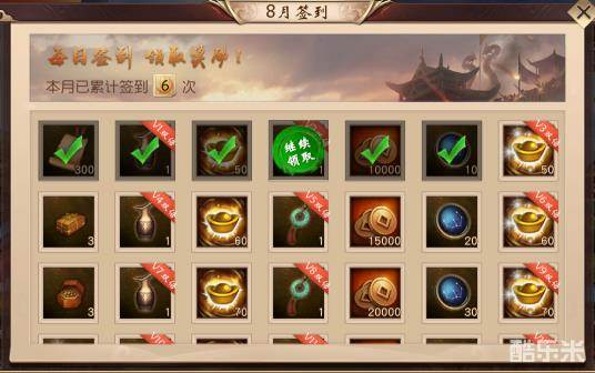 签到中,有部分奖励,还可以拿双倍呢!不过是根据vip来算的呢!领取的奖励可获得双倍,签到是每日必不可少的一项工作,签到领取的青梅酒可单抽奖一次,签到领取的绝世佳酿可来个十连抽。其他像元宝、玉璧、铜币、将星等奖励不用一一说了,请看已签到获得的奖励图。