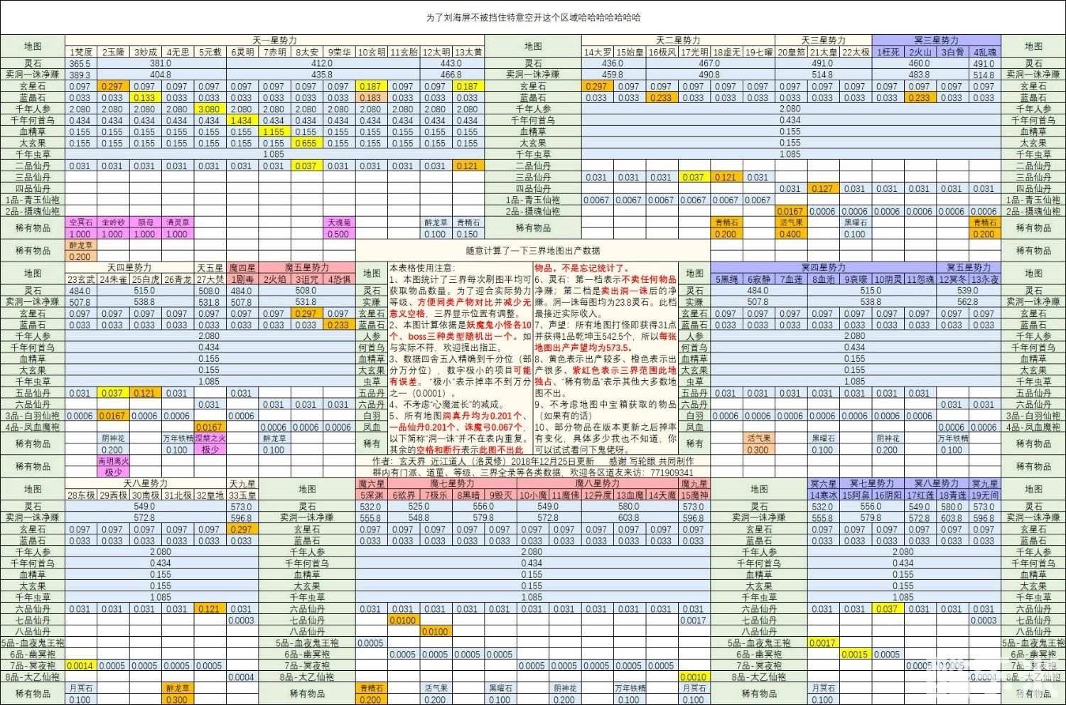 一个是包含了所有三界的内容,将天一到天九还有魔一到魔九和冥一到冥九所有的材料收益都给记录了进去,整张图看起来非常复杂,玩家需要耗费一定的时间才可以了解。