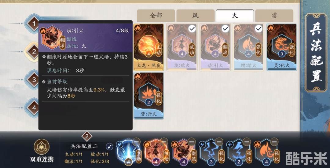 2)雷和火相对输出能力更高一些,不管是被动,翻滚,还是强化都优先选择增加输出的兵法,类似风的加盾技能,和雷的回血技能可以先不升级。比如火属性的翻滚火墙是我很喜欢用的一个技能,近战职业拉怪拉得好,靠翻滚火墙也能打很高的输出。