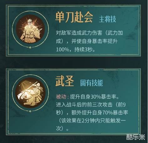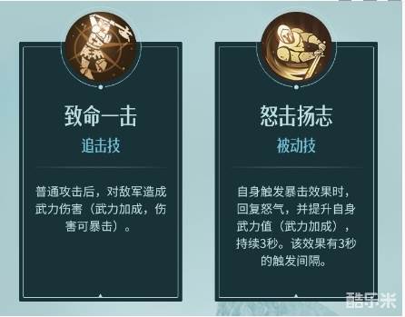 被动:自身触发暴击效果时,回复怒气,并提升自身武力值(武力加成),持续3秒。该效果有3秒的触发间隔。
