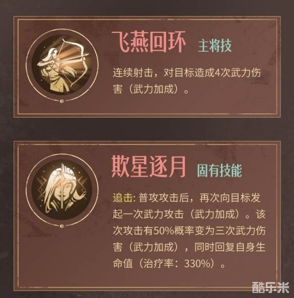 追击:普通攻击后,再次向目标发起一次武力攻击(武力加成),该次攻击有50%概率变为三次武力伤害(武力加成),同时回复自身生命值(治疗率330%)。