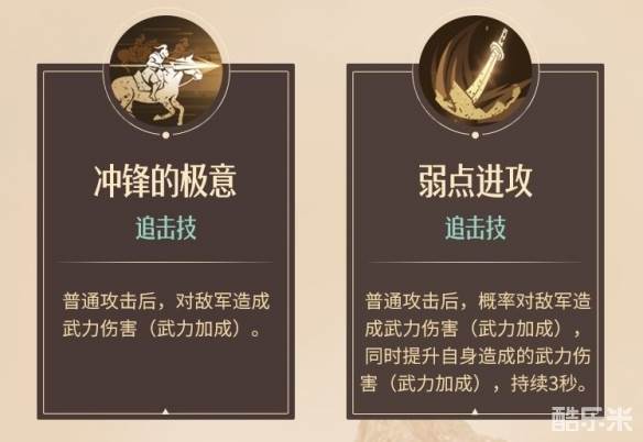 追击:普通攻击后,概率对敌军造成武力伤害(武力加成),同时提升自身造成的武力伤害(武力加成),持续3秒。