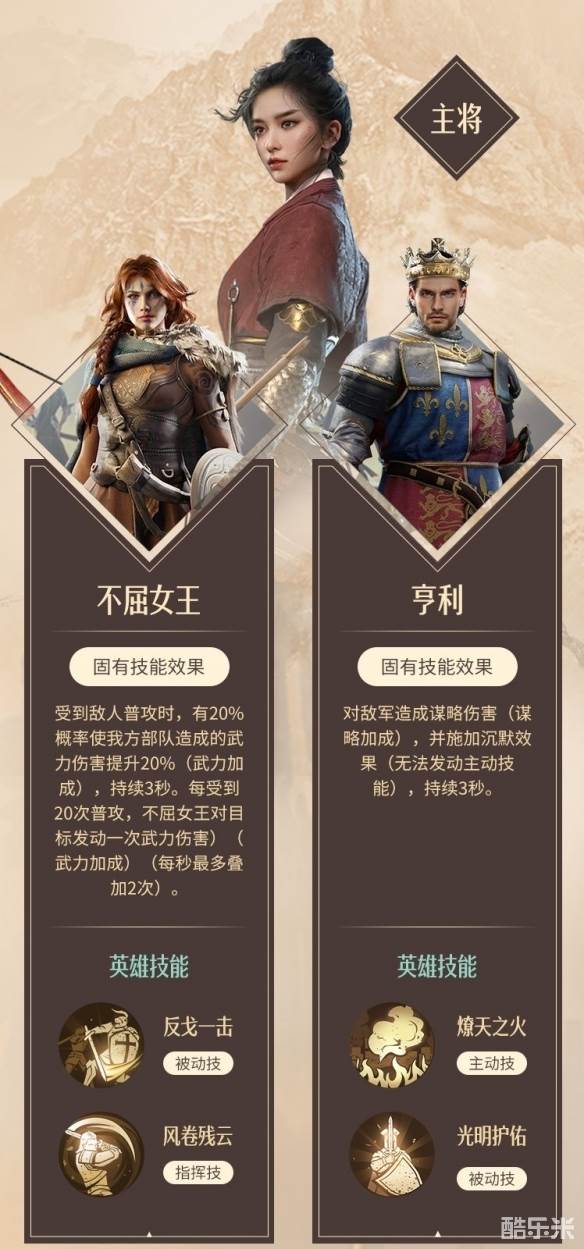 魏兰装备输出向的追击技能,是阵容的主力输出点。不屈女王可以为队伍提供伤害加成,同时提供不错的输出能力。亨利提供稳定控制和续航辅助。