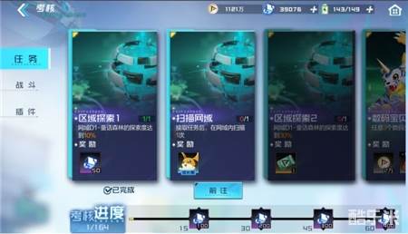 考核任务(即任务界面第一个)相当于新手教程,会逐阶段展开游戏中的各大模式任务。包括区域内的探索、数码宝贝的养成、新模式的熟悉及关卡进度的推进。