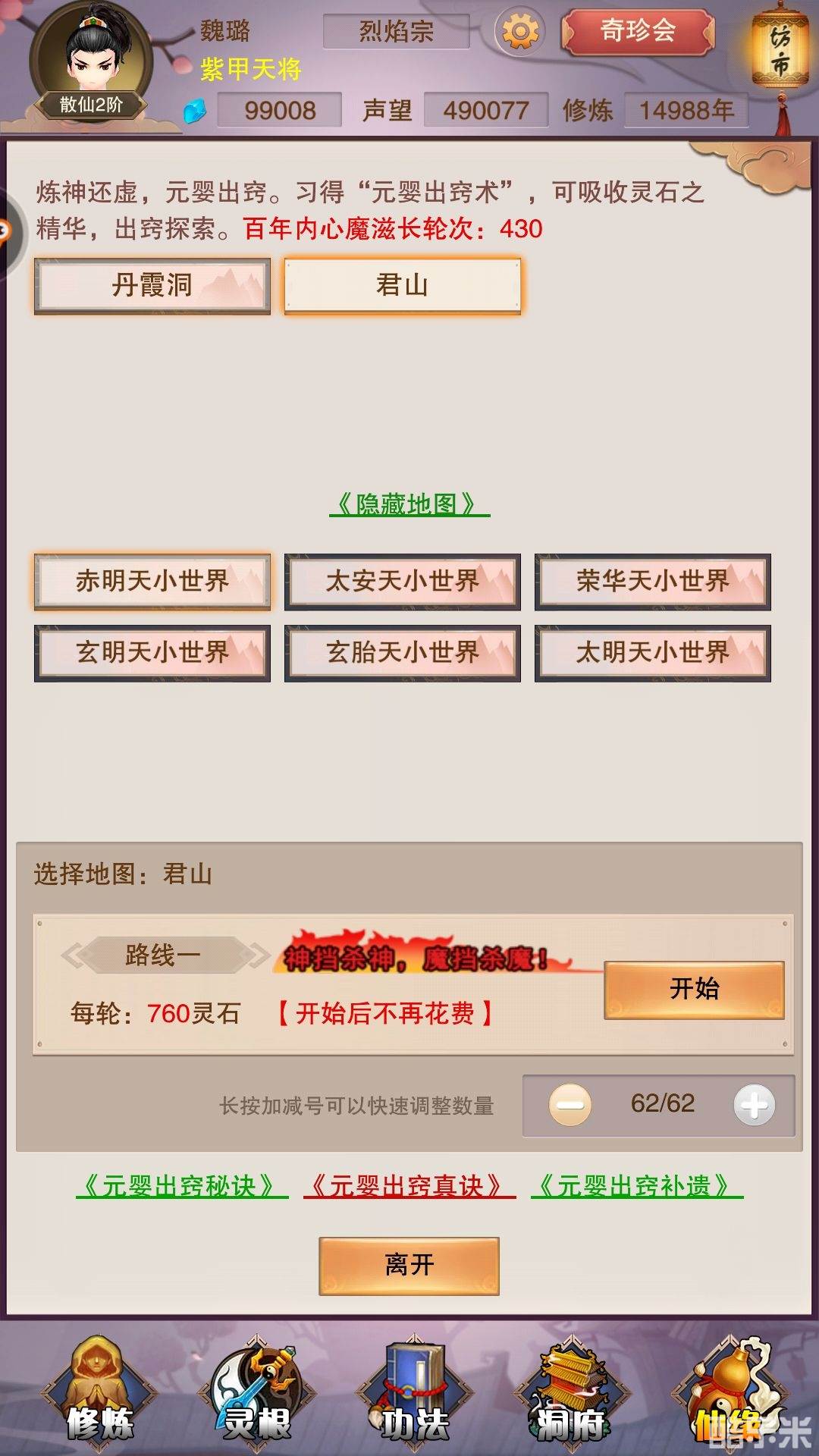 刚刚出窍时一次挂机轮数只有五次。随境界升高。大约是大乘还是洞真的时候,会达到25次的最大值。此后不随境界提升。但是可以依靠定魂丹提升。一颗加一次。