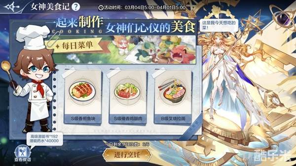 活动内容:佳节来临,你将化身食神,为女神们烹饪菜肴。通过查看女神食谱,可揭秘美食料理的配方,根据配方信息挑选食材,挑选正确即可解锁菜谱!解锁菜谱达到指定数量,累计可领取高级潜能书*192(任选)、潜能药水*40000等奖励!