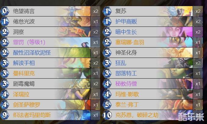 在对阵报告骑这类群体buff卡组时,牧师在前期的aoe法术就显得格外重要了,并且留下护甲商贩,罪罚这类低费卡牌,保证这套卡在三费前场面不会失控,一但进入4费,这套卡的解场手段就相当之多了。