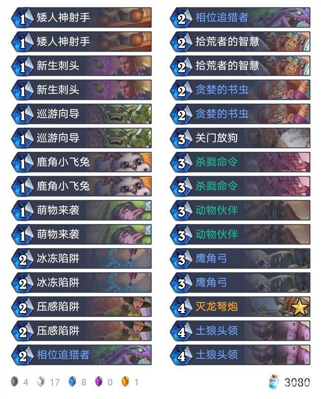 目前比较主流的玩法与上个版本有所差别,舍弃了支线任务和各种直伤亡语随从,转而使用低费随从【新生刺头】和【鹿角小飞兔】站场,利用高频次的攻击压低对手的血线,然后用直伤法术【杀戮命令】和橙卡【灭龙弩炮】斩杀。