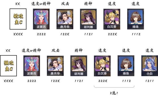 敏攻主c+速度/精神波赛西+攻击唐月华+精神胡列娜+速度白沉香+速度降珠