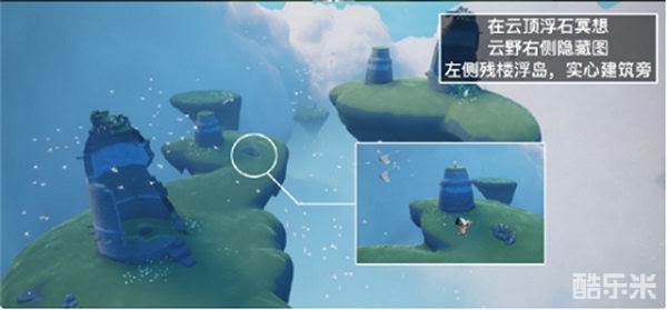 4、在云顶浮石冥想:在云野右侧隐藏图左边残楼浮岛,在实心建筑旁的石碑前光圈处打坐并留言,完成第四个任务。