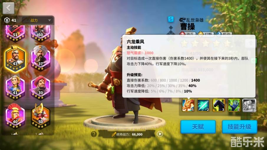此外曹操一技能还能降低40%的对方攻击力,并且有几率回血,提高了生存能力,在满编T3或者T3T2骑兵混编的情况下,轻轻松松就能拿下圣坛。