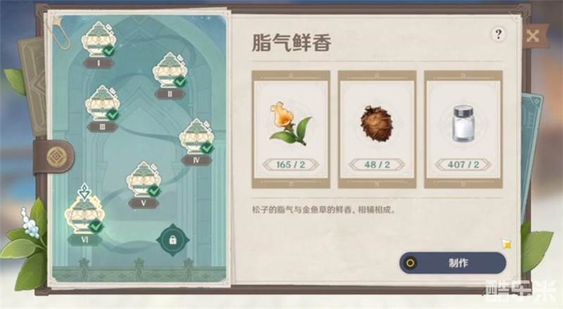 制作脂气鲜香需要金鱼草、松果、盐三种材料,收集好之后就可以来制作香料了,直接点击按照下图的顺序来投放你的材料,点击区间即可,简单方便,无脑操作。