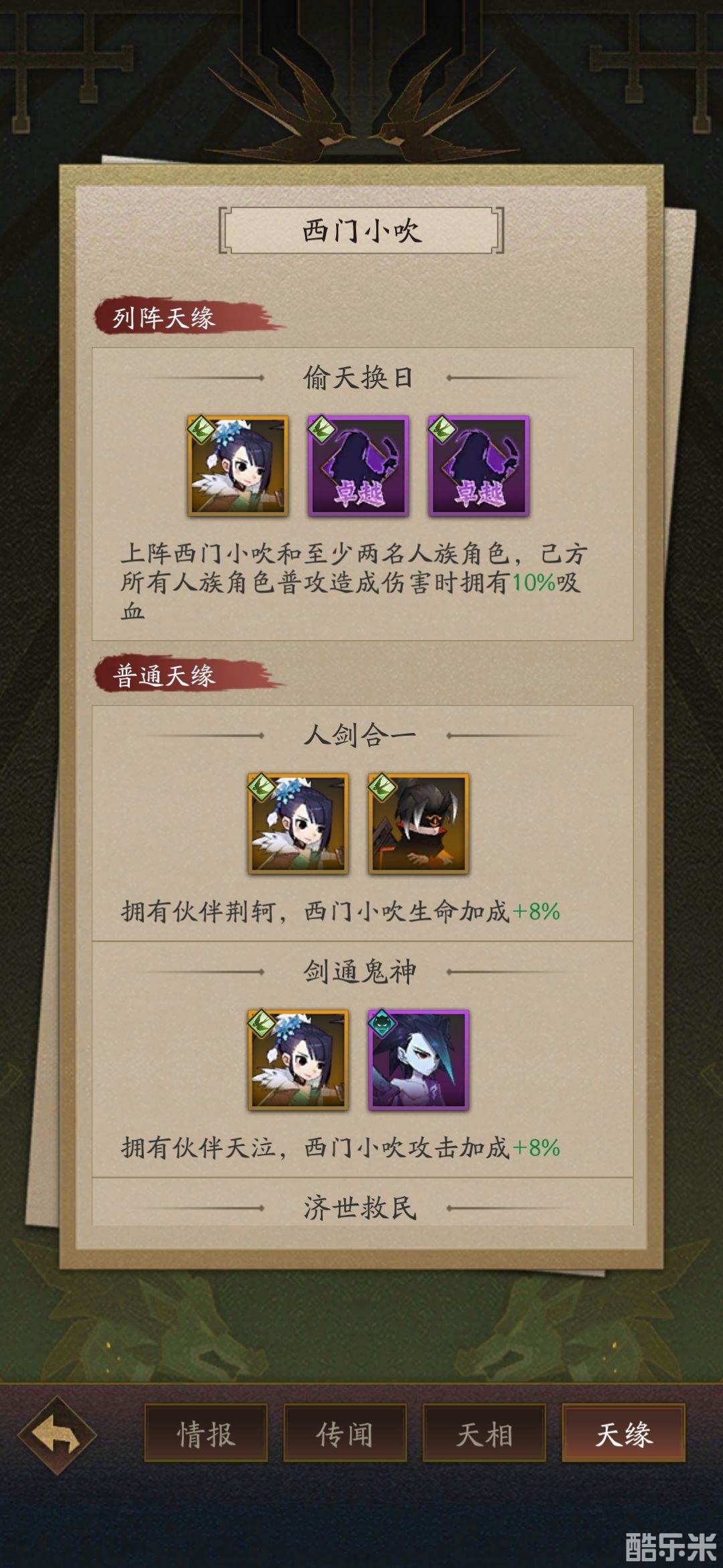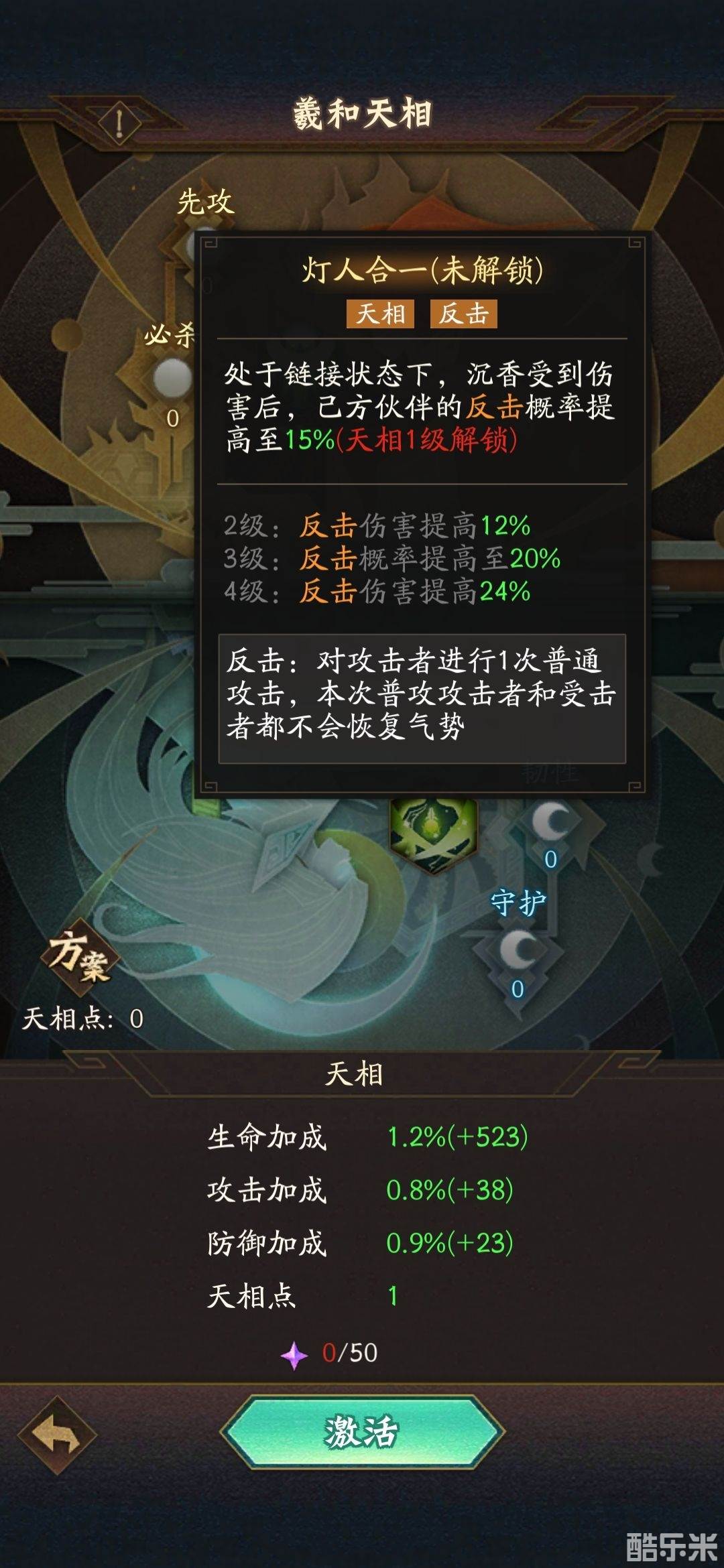 另一种天相我在这儿则推荐一套反击流打法,核心队友是沉香,开启大招后把五个队友连起来,谁挨打都有概率触发反击,反击算是普攻,普攻又能触发天相的三连击,在这套防守反击的队伍里西门小吹是绝对的主C,言灵随便带输出类的就好,有理想的攻其不备最好。(但我实际测试下来好像有点bug,要是沉香没点天相小吹好像不能反击因链条设计的伤害,这和以前页游时代是不一样的,希望能够修复,不然少一套流派太局限发挥了)。