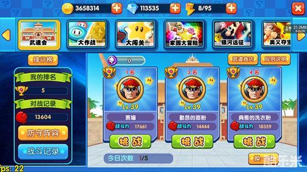 玩家在武道会界面可以看到比自己排名靠前的三个玩家。点击任意一个玩家即可挑战,每天有5次免费挑战的机会,没有过足瘾的玩家可以花少量钻石重新购买挑战次数!