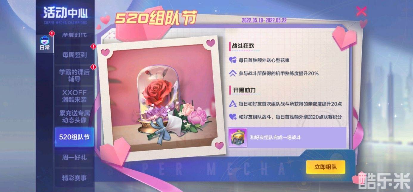 520在即,叫上好机友一起上线开黑,亲密加成蹭蹭蹭!5月19日至5月22日,“520组队节”活动期间,选手们可享受联赛积分、机甲熟练度以及亲密度加成!完成首次组队战斗更可得奖券奖励!