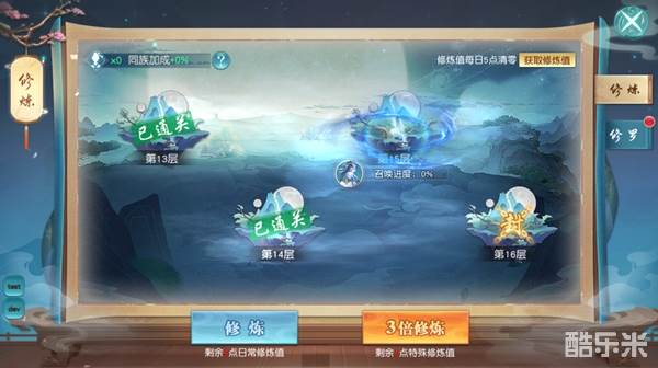在前期的新手引导任务会引导开启修炼塔系统,玩家可通过日常活动或使用修炼值道具增加修炼值,修炼值分为普通修炼值与特殊修炼值。普通修炼值在修炼之地内获得正常系数经验与打怪数量加成,特殊修炼值在修炼之地内获得3倍系数经验与打怪加成。修炼塔每层会有一定打怪任务,当打怪数量叠加满后可挑战关卡boss,挑战成功后可进入下一层挂机修炼,不同层数挂机产出经验不同,当然是越高越好。这里还有一个小技巧就是修炼的时候最好找到同部族玩家一起挂机,会有额外的经验加成。