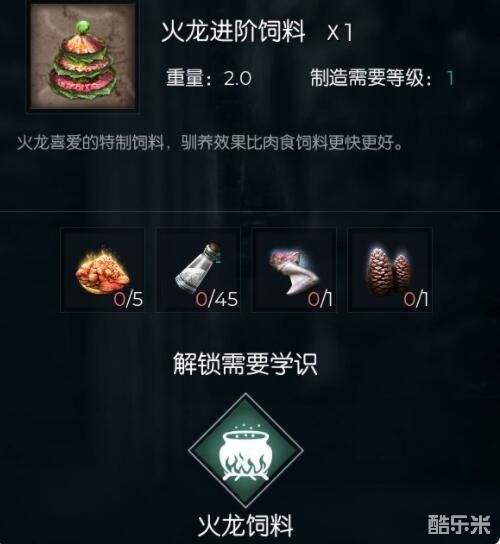 火龙:高级肉饲料:225 盐:2025 狮鹫翅膀:45 松塔:45(现阶段顶级宠物,听说强度不是很强,可能还没做好)