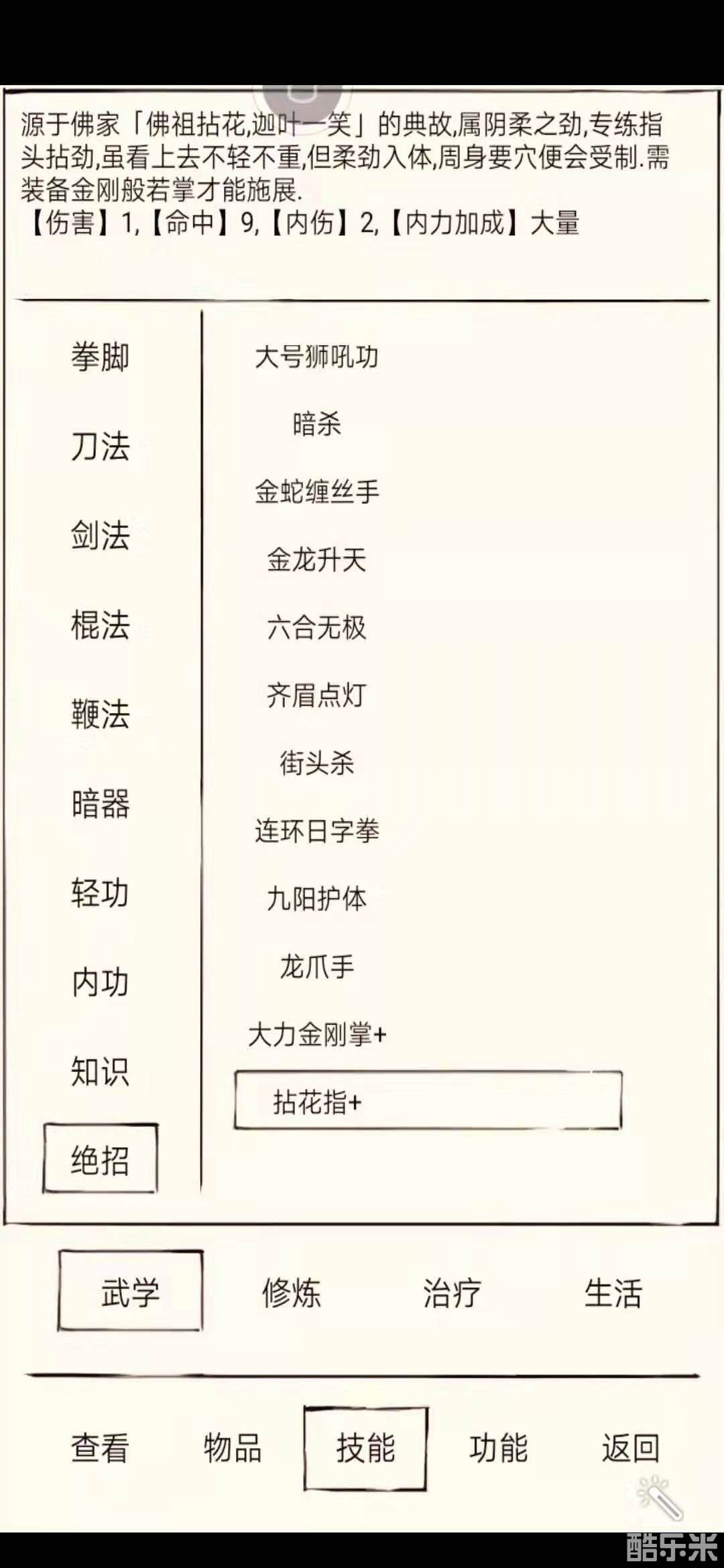 拈花指内力加成,但是并不大,命中虽看上去是【9】,实则命中很高,效果:点穴